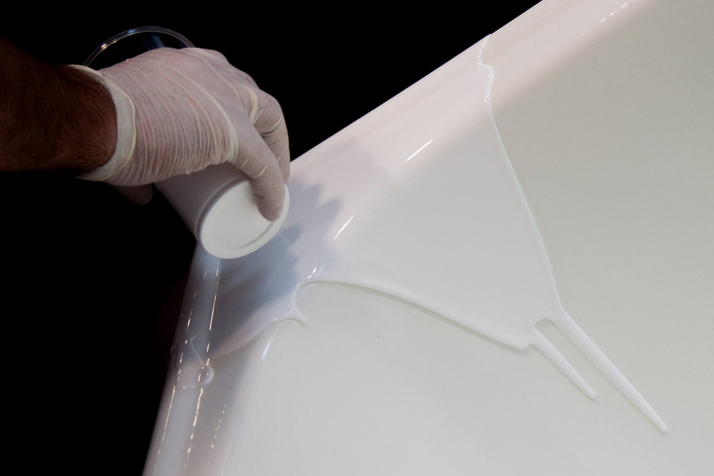 - Акрил наносится в 2 этапа. Первый этап подразумевает грунтование основания ванны. Акрил втирается резиновым шпателем в стенки ванны. Тем самым забиваются все микропоры. Улучшается адгезия жидкого акрила с основанием ванны. Второй этап, жидкий акрил наливается сверху на борта и самотеком опускается до самого дна. Таким образом слой получается достаточно толстым и будет максимально прочно держаться.